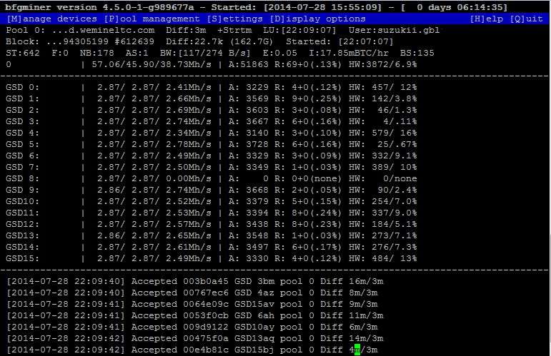 Code: bfgminer version 5.5.0 - Started: [2014-06-10 20:13:01] - [ 0 days 06:15:32] [M]anage devices [P]ool management [S]ettings [D]isplay options [H]elp [Q]uit Pool 0: ...ning.eligius.st Diff:128 +Strtm LU:[02:28:32] User:1QATWksNFGeUJCWBrN4g6hGM178Lovm7Wh Block #305190: ...6e8ba4d9 Diff:11.8G (84.16P) Started: [02:07:22] I:1.04mBTC/hr ST:156 F:0 NB:31 AS:0 BW:[269/ 12 B/s] E:1127.28 BS:21.8M 5/24 63.0C | 94.10/98.68/95.60Gh/s | A:1974 R:2+2(.20%) HW:5729/2.6% -------------------------------------------------------------------------------- BFL 0: 54.0C | 8.11/ 8.10/ 7.65Gh/s | A: 62 R:1+2(4.6%) HW: 273/1.3% HBR 0: 63.0C | 22.91/22.85/21.55Gh/s | A: 208 R:0+0(none) HW:3022/5.4% TBF 0: 28.0C | 5.13/ 5.10/ 4.89Gh/s | A: 49 R:0+0(none) HW: 331/4.5% PXY 0: | 27.85/30.23/29.84Gh/s | A: 358 R:1+0(.28%) HW: 450/1.0% RKM 0: 40.0C | 30.10/32.40/31.67Gh/s | A:1297 R:0+0(none) HW:1653/.92% -------------------------------------------------------------------------------- [2014-06-11 02:28:10] Accepted 00c819ef HBR 0d Diff 327/255 [2014-06-10 02:28:13] Accepted 012058dd PXY 0 Diff 227/128 [2014-06-11 02:28:15] Accepted 01778be1 RKM 0b Diff 174/128